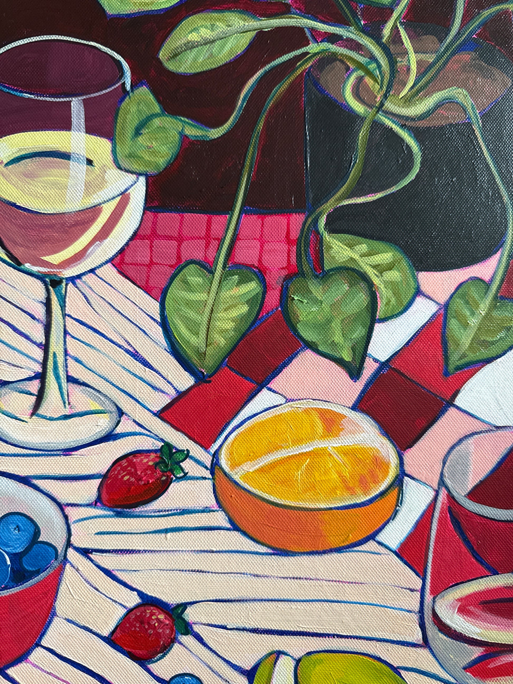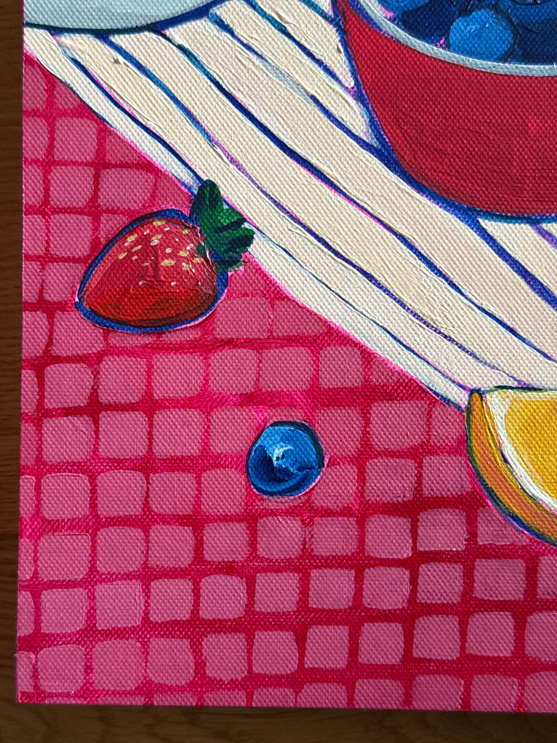 Bold outlines and saturated colour give the composition a playful, nostalgic warmth, while the rhythmic grid of the tablecloth adds movement and structure. Everyday ingredients are elevated into a moment of abundance — fresh, generous and full of life.
