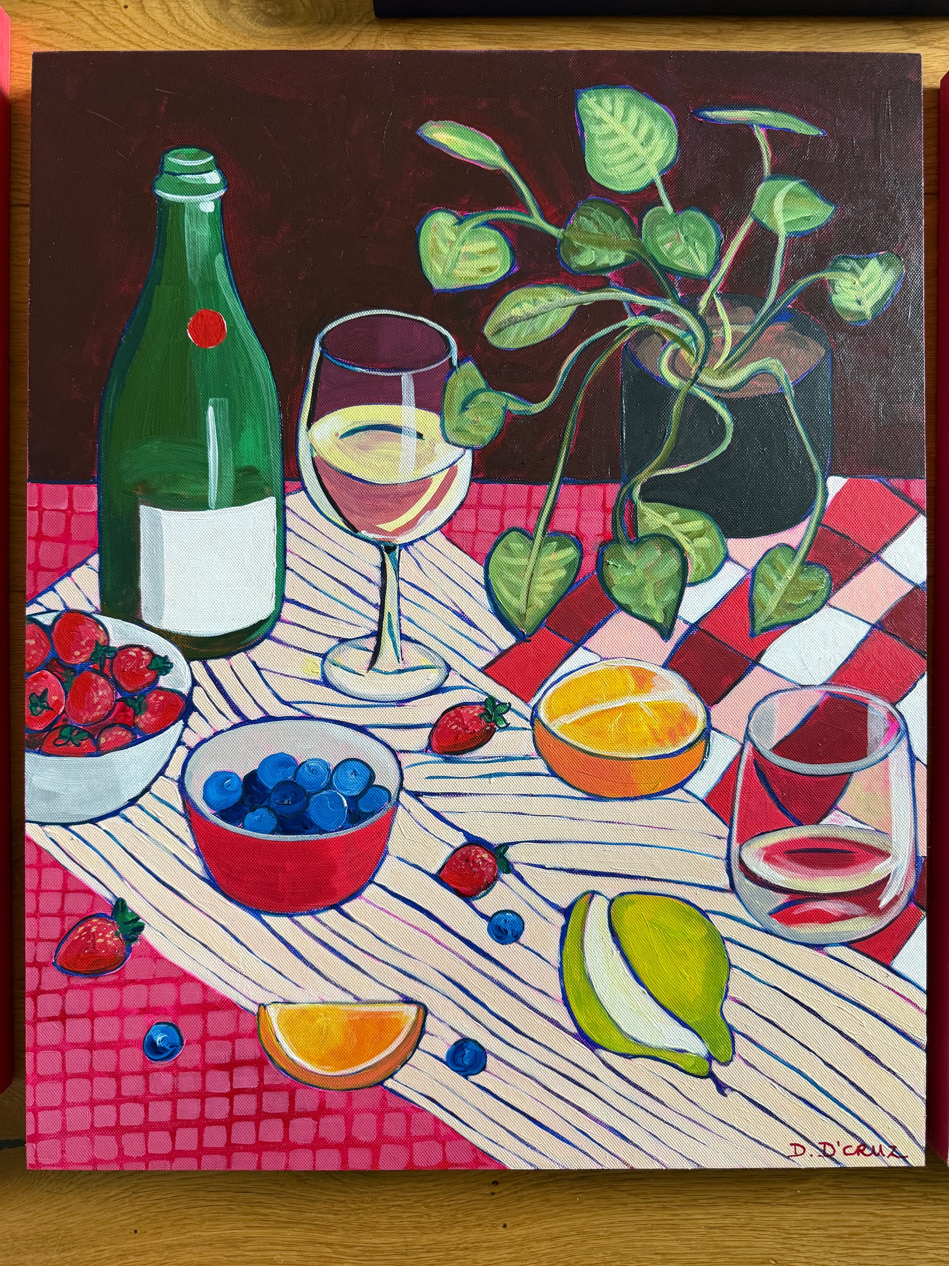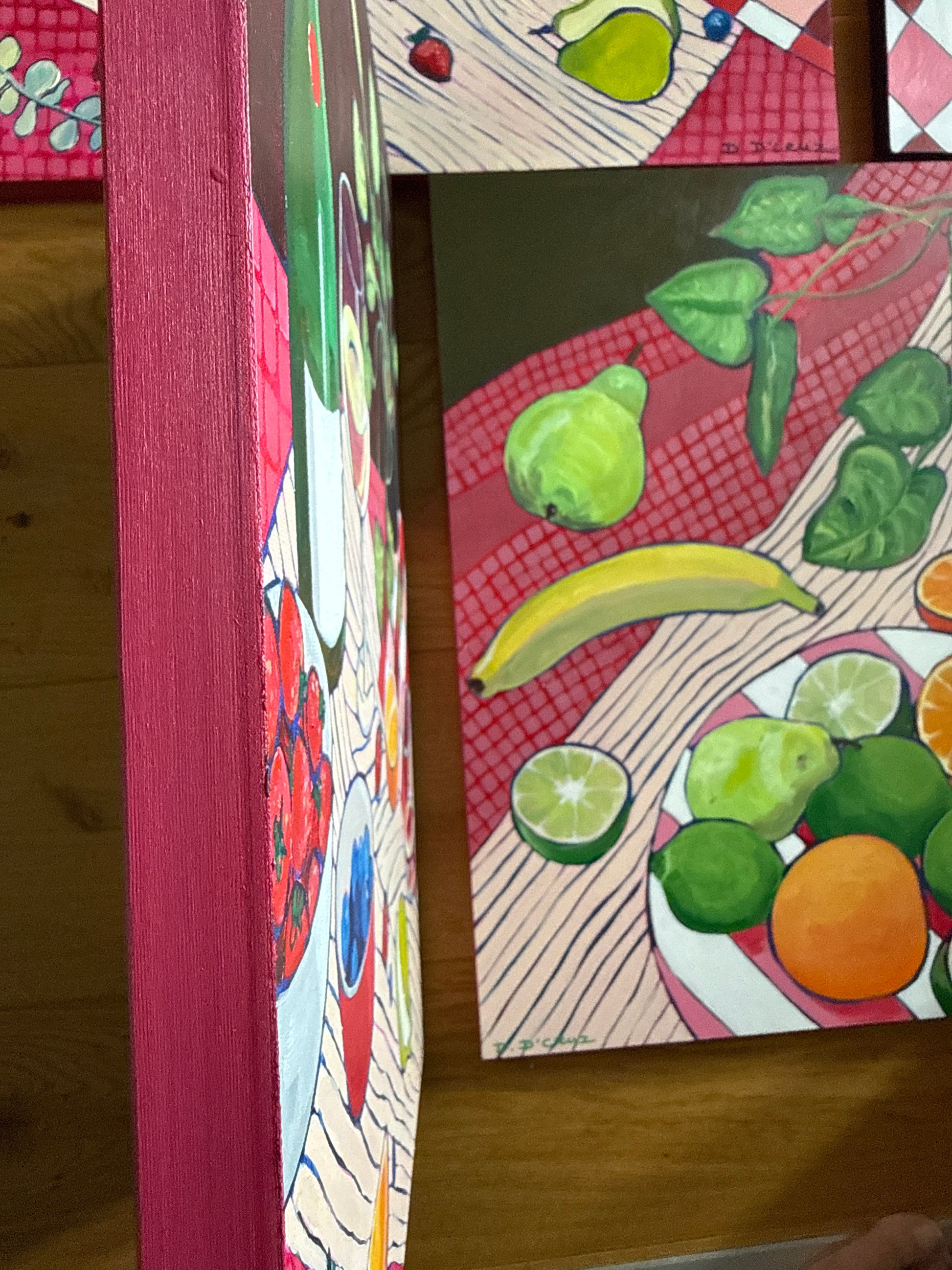 Edges of the canvas board are painted in a vivid red.